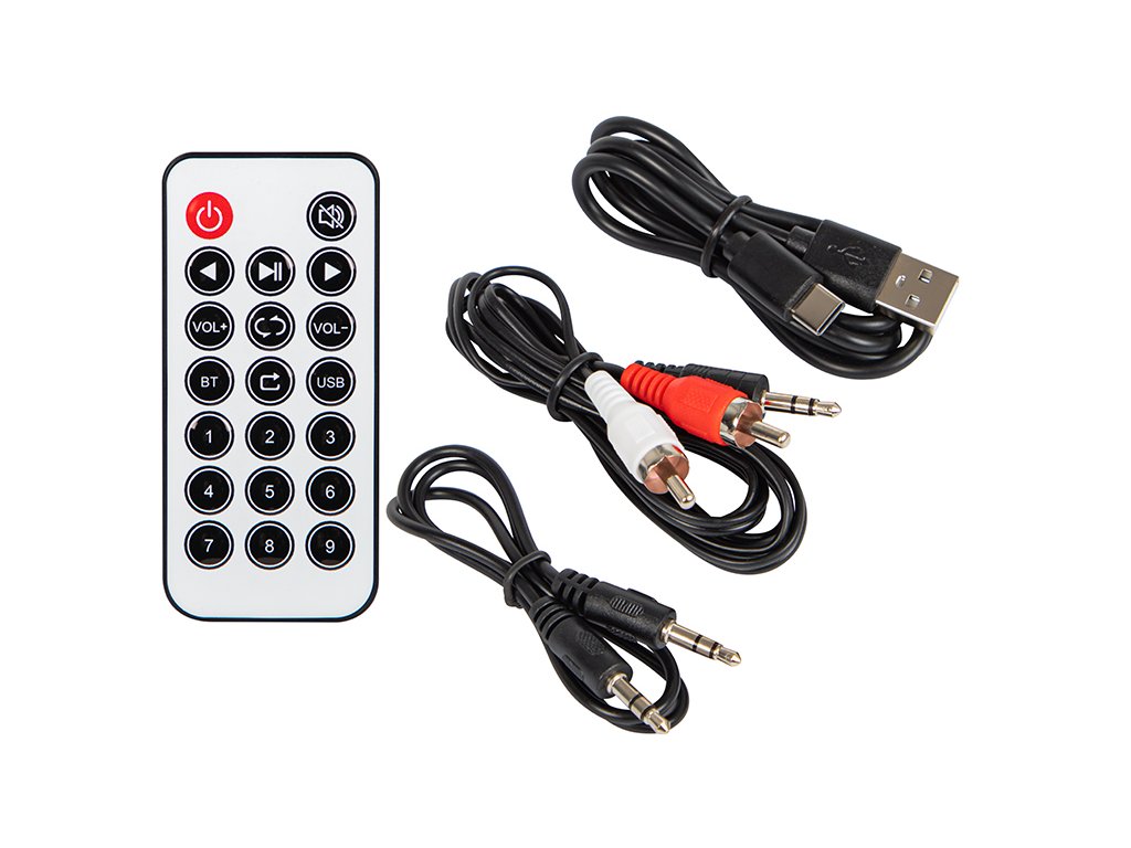 - Súčasť balenia: prijímač, diaľkové ovládanie, USB kábel, kábel 3,5 mm - RCA