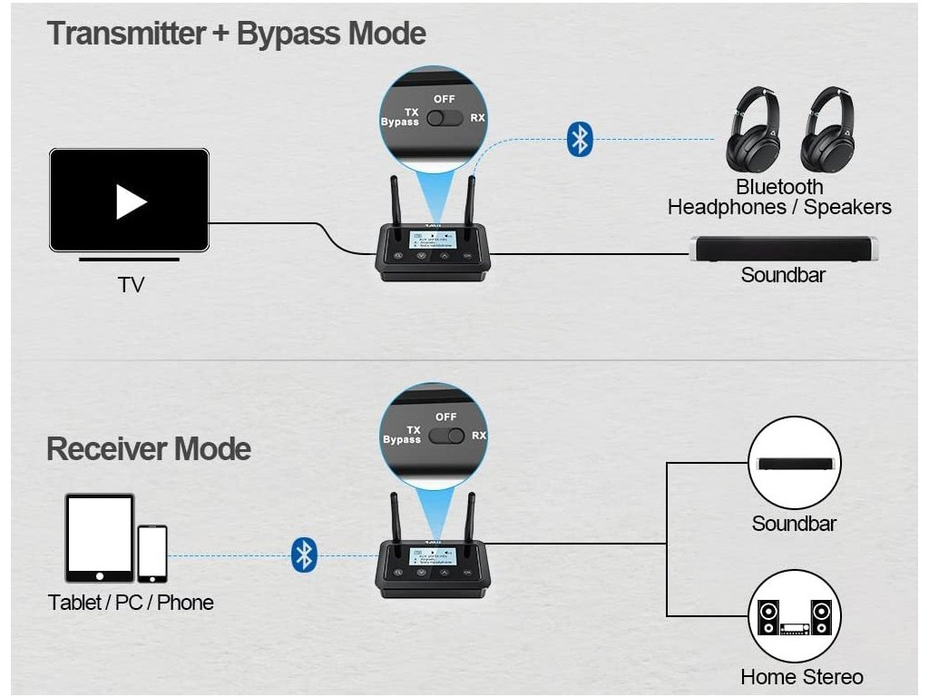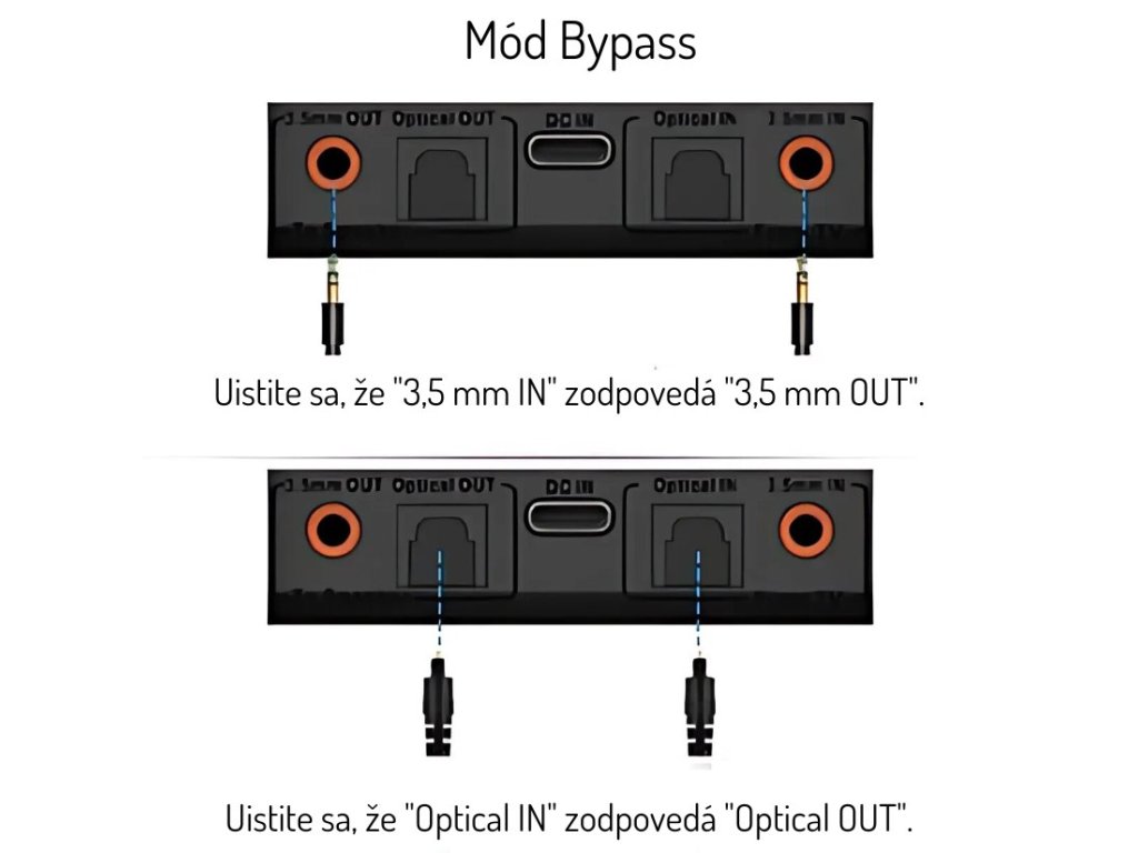 - Bypass mód funguje iba s rovnakým typom vstupu/výstupu. Ak je vstup cez audio kábel Aux, výstup musí byť tiež spojený s Aux. Ak je vstup cez OPT, výstup musí byť tiež cez OPT. -Na dosiahnutie nízkej latencie by malo prijímacie zariadenie podporovať aptX Low Latency. Inak môže byť použité iné kodeky (napr. SBC, aptX), čo môže viesť k oneskoreniu zvuku 70–200 ms, ktoré môžu byť pre niektorých používateľov rušivé.