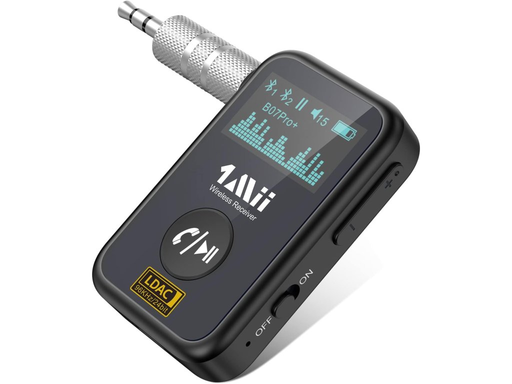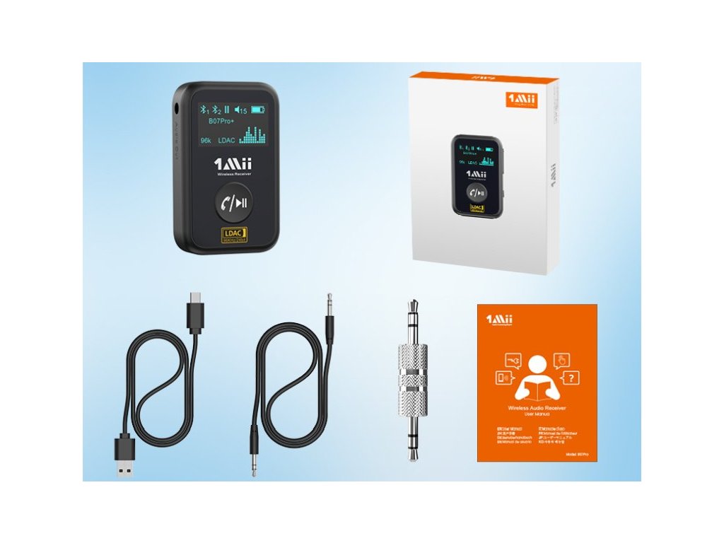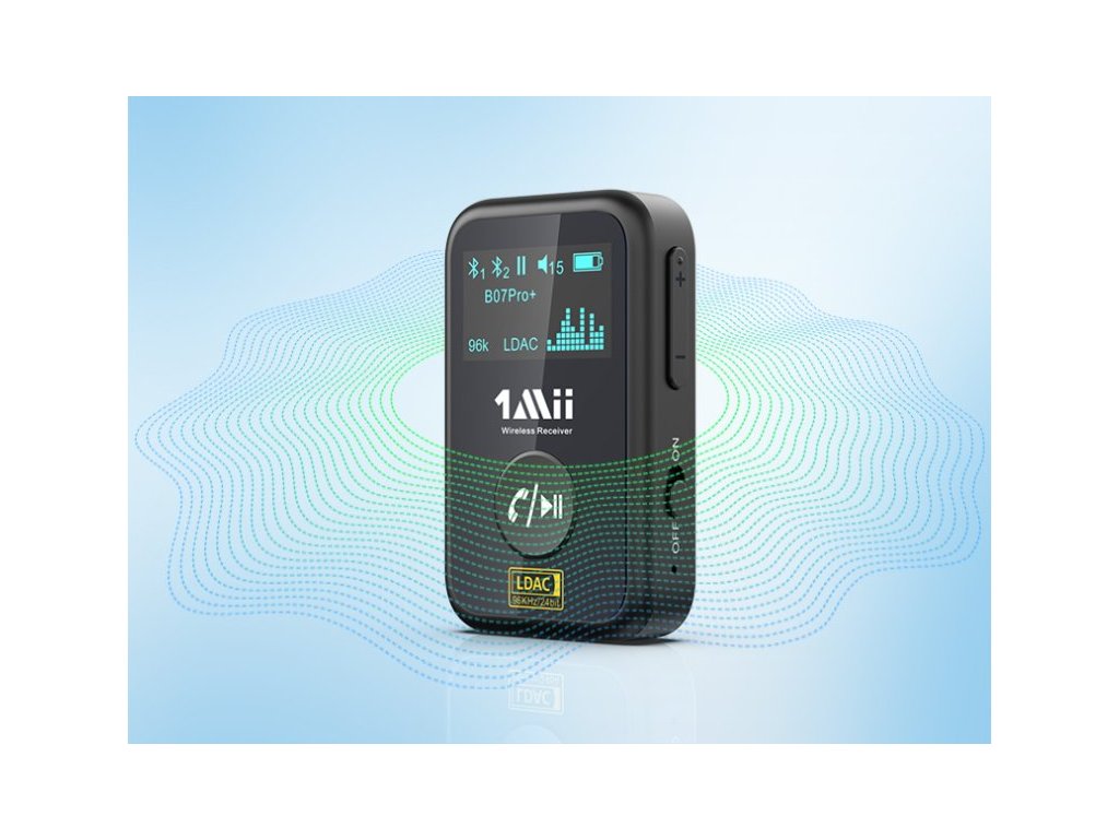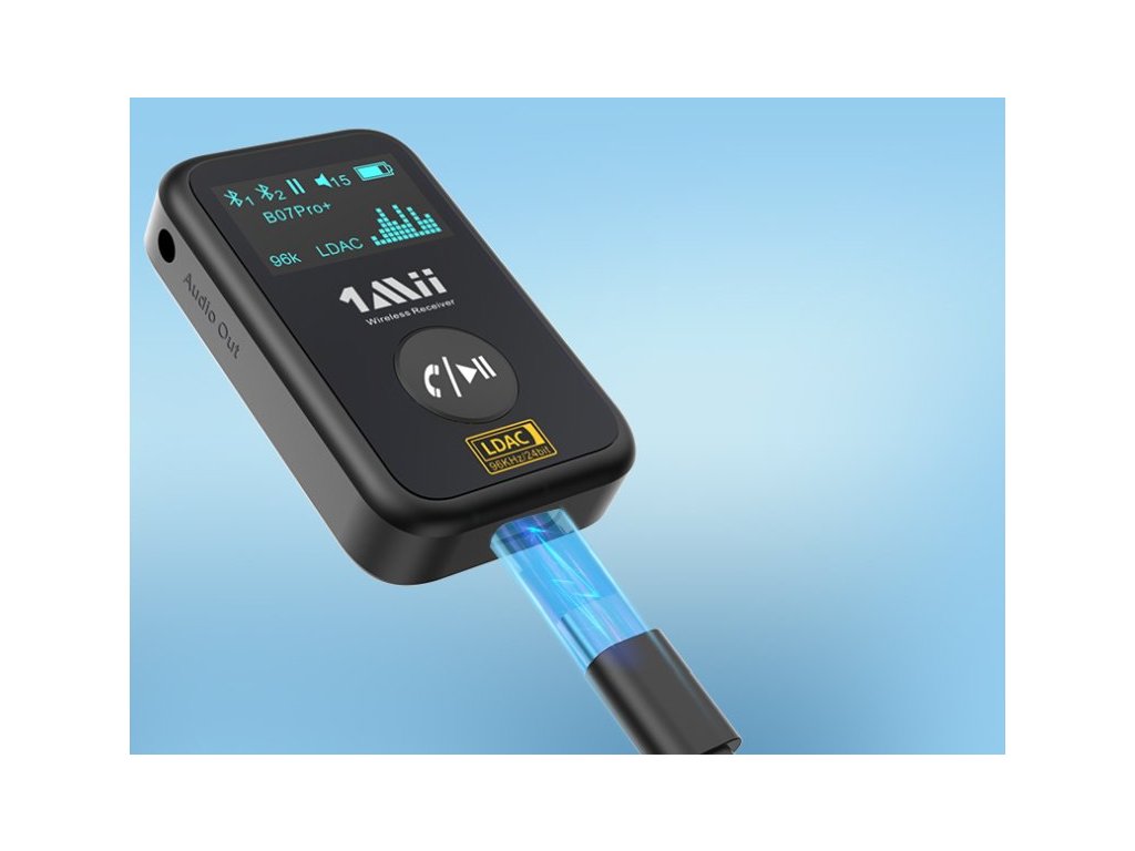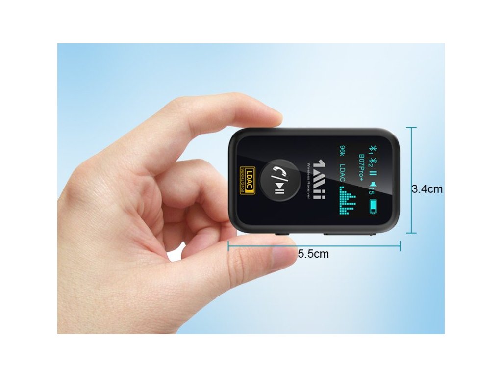 Bluetooth přijímač 1Mii B07PRO+ s OLED displejem, LDAC/aptX HD, výdrží 10h a podporou hands-free. Ideální pro auto, Hi-Fi či sluchátka.