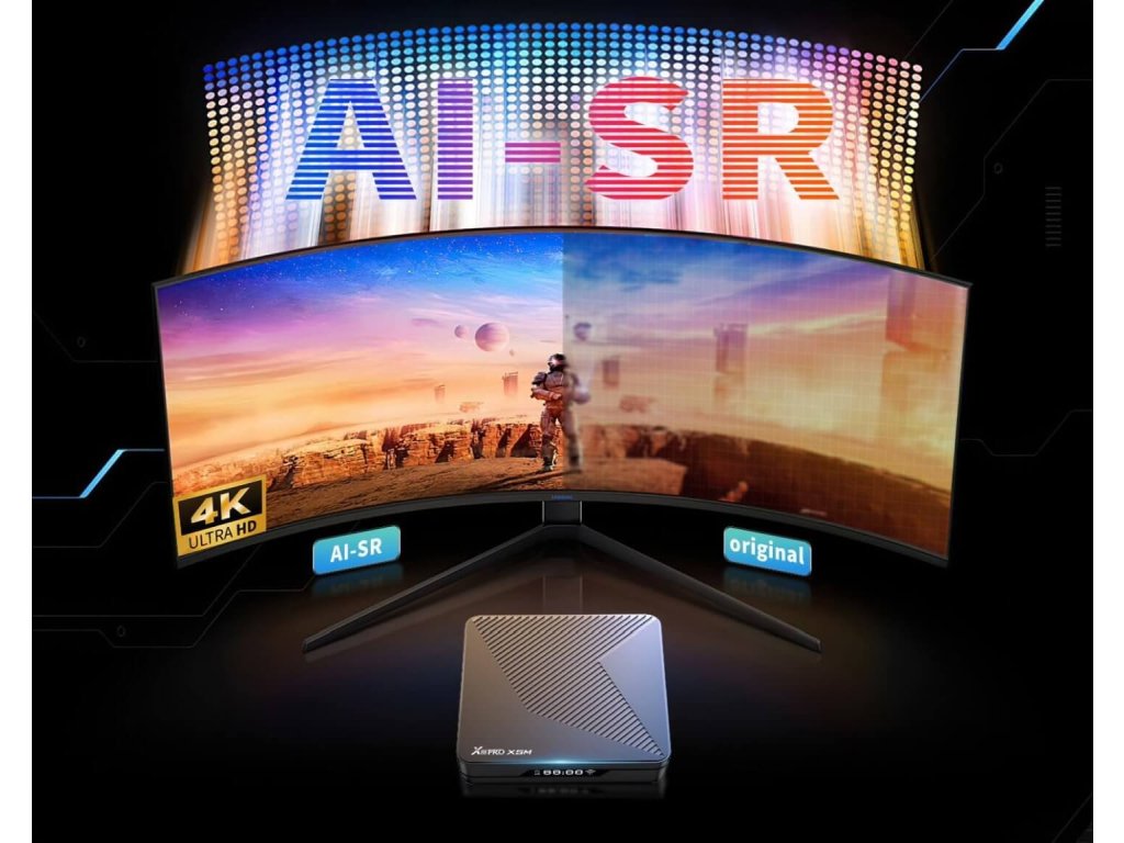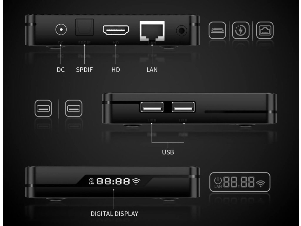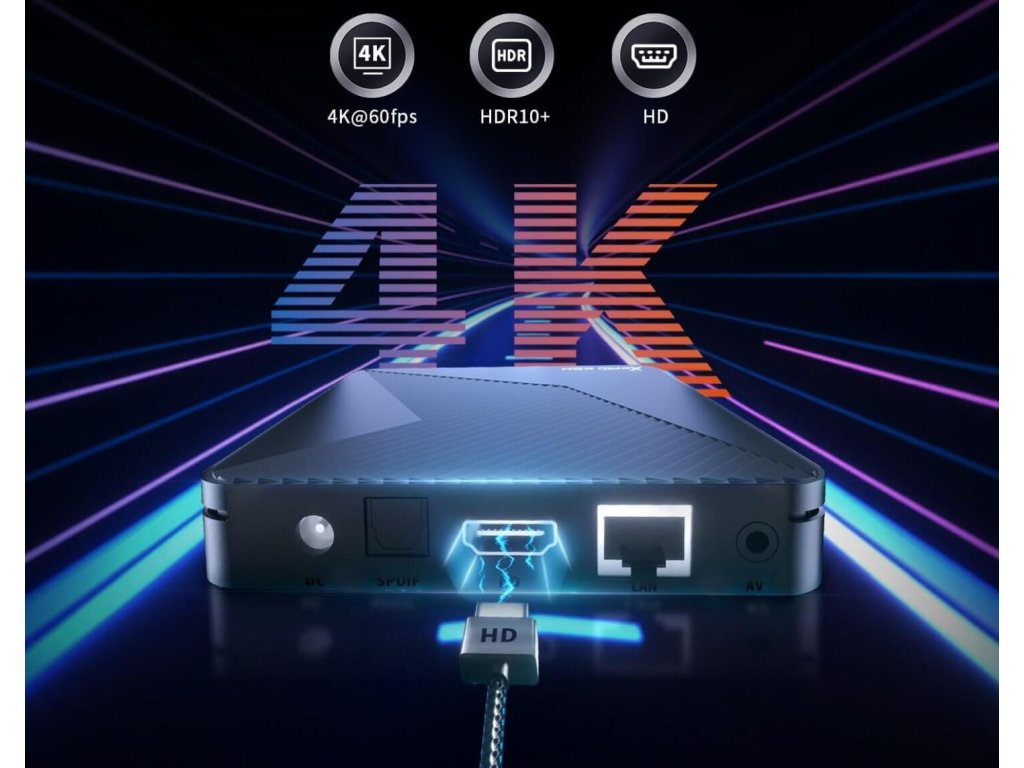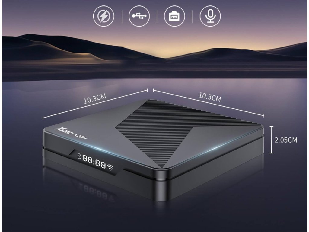 Rychlý Android 14 box s čipem S905X5M, 4GB RAM, 32GB, 4K HDR , AV1, Wi-Fi 6, Gigabit LAN, Bluetooth ovladačem a VFD displejem. Ideální jako Mediaplayer, pro IPTV a multimediální aplikace.