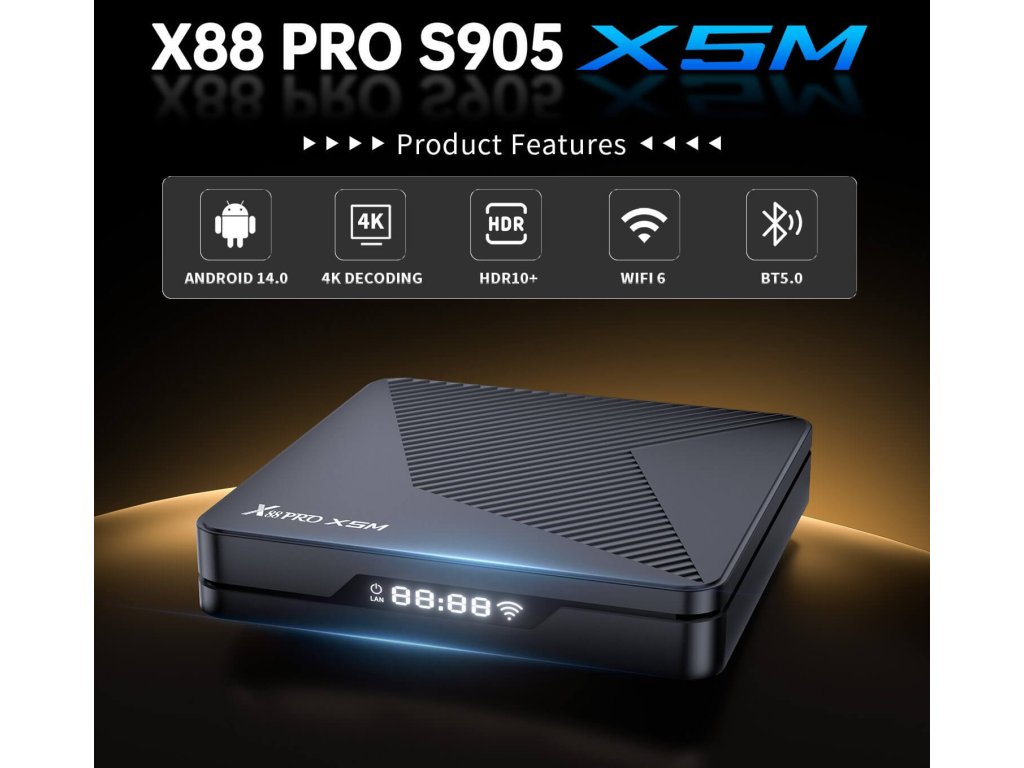 DI-WAY AND-X88PRO X5M patří mezi výkonná multimediální centra s novým chipsetem S905X5. Přináší moderní Android 14 , nový čipset Amlogic S905X5M , rychlé připojení Wi-Fi 6 a Gigabit LAN , spolu s podporou 4K videa a širokým spektrem multimediálních formátů. Je vhodný jako mediální přehrávač, ideální jako mediaplayer, nebo pro IPTV či YouTube a systém je navržen jako otevřený systém (Android AOSP). Výhodou takového systému je, že můžete využít velké možnosti úprav prostředí, alternativních launcherů, vlastních souborových manažerů nebo síťových nástrojů