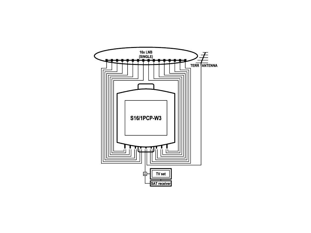 17in/1out 1.1&1.2 přepínač pro až 16 satelitních pozic a 1 uživatele, doplněný o slučovač s pozemním pásmem. Je určen k přepínání mezi 9 až 16 LNB. Řídící mód je volen vestavěným DIP-spínačem, podrobnosti viz Návod k použití.