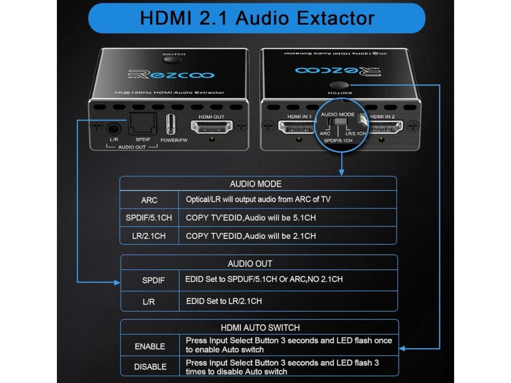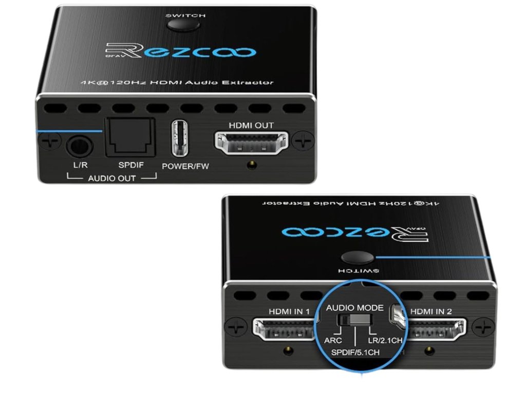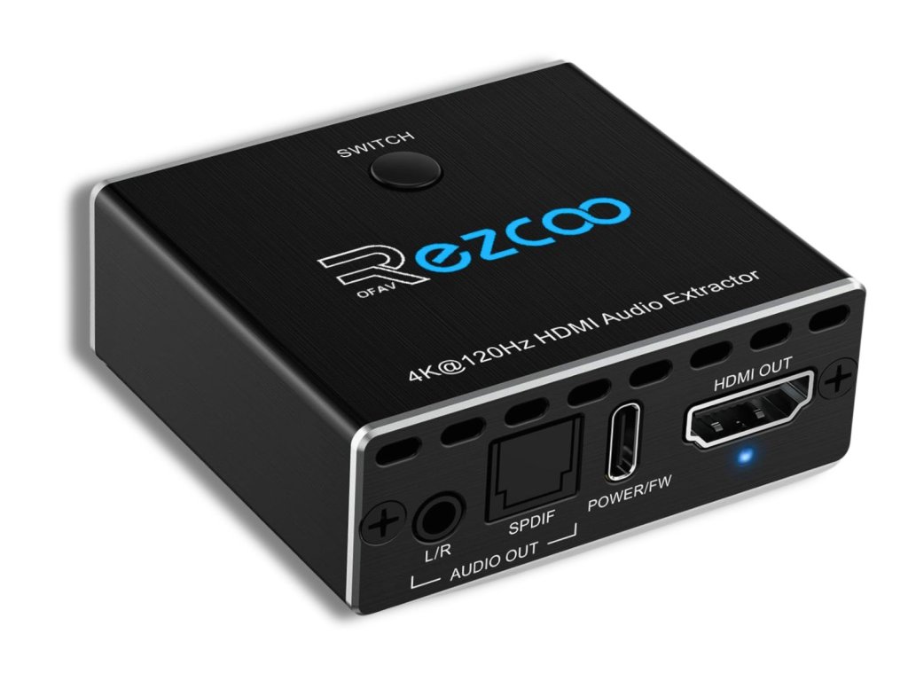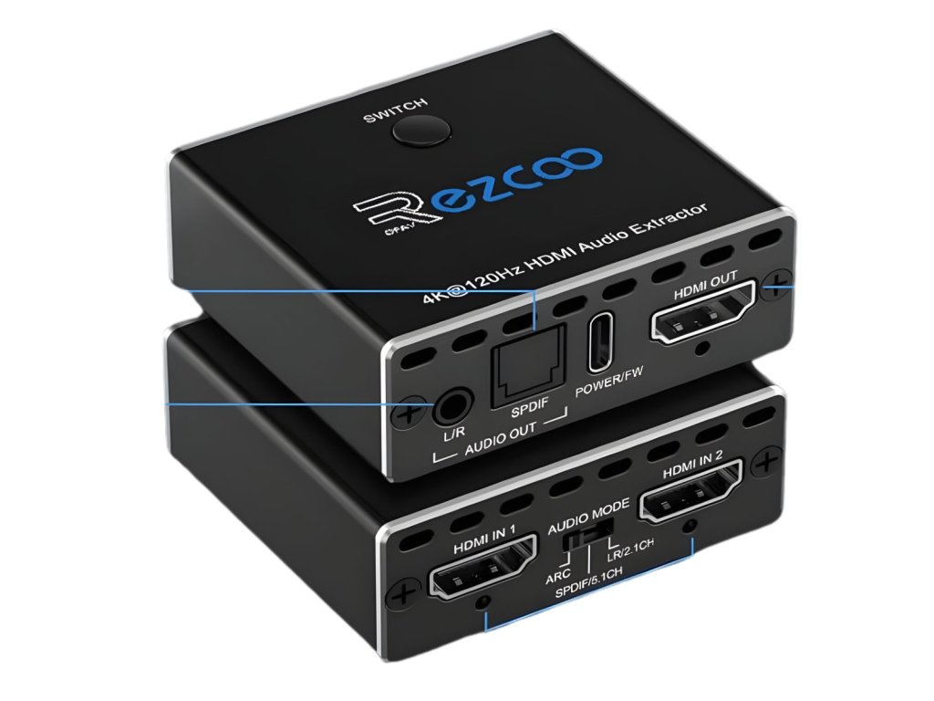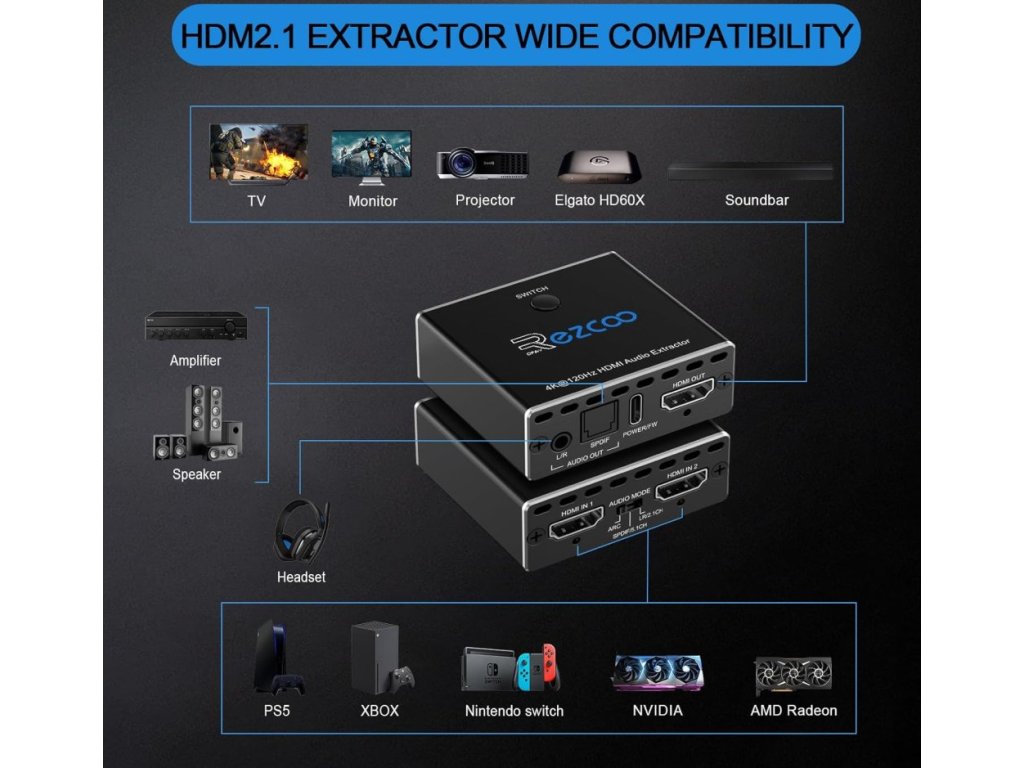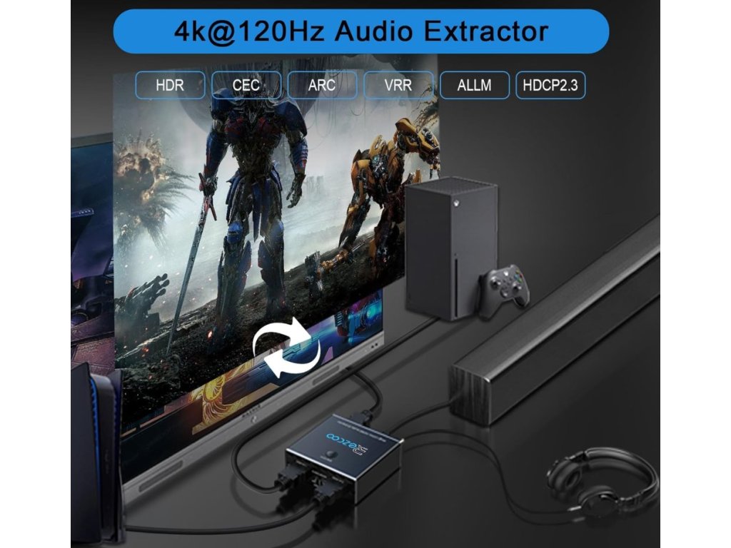 Ezcoo HDMI 2.1 Audio Extractor a HDMI přepínač 4K 120Hz je kombinace 2 portového HDMI přepínače a výkonného audio extraktoru pro moderní herní konzole, PC i TV. Umožňuje oddělit zvuk z HDMI signálu do optického SPDIF nebo analogového L/R výstupu bez omezení kvality obrazu.