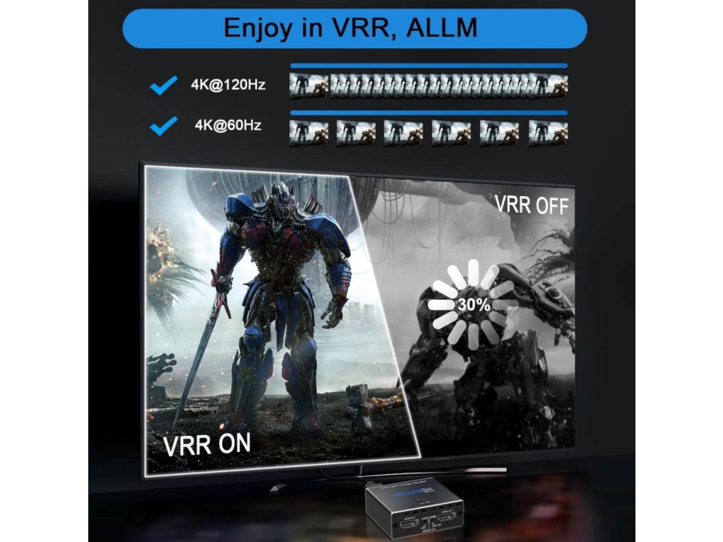 Extractor přenáší plnohodnotný HDMI 2.1 signál včetně 4:4:4 barev a vysokých obnovovacích frekvencí. Podpora VRR a ALLM zajišťuje plynulé hraní bez trhání obrazu. Zařízení je kompatibilní s HDR10 i Dolby Vision.