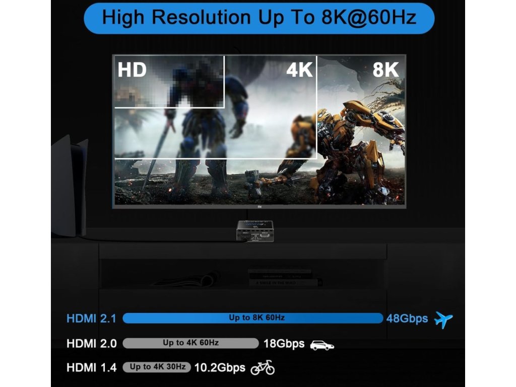 Podporovaná rozlišení zahrnují: 8K při 60 Hz, 4K při 120 Hz, 5120 × 1440 při 120 Hz a 1080p při 240 Hz. Pro stabilní funkčnost se doporučuje použít HDMI 2.1 kabel do 3 m a napájení minimálně 5V 1A nebo více .