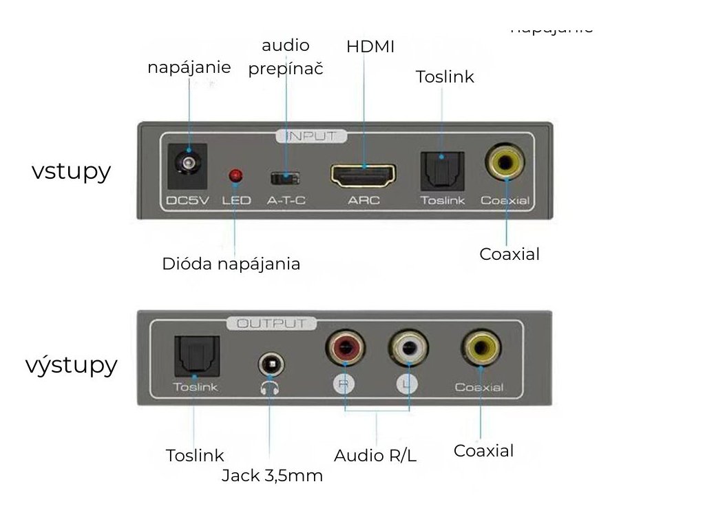 - Výstupy: Toslink, koaxiální, L/R CINCH, jack 3.5 mm
