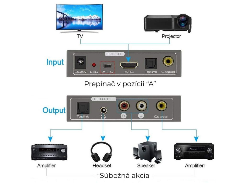 - Zařízení nepřepíná video, řeší jen zvuk.