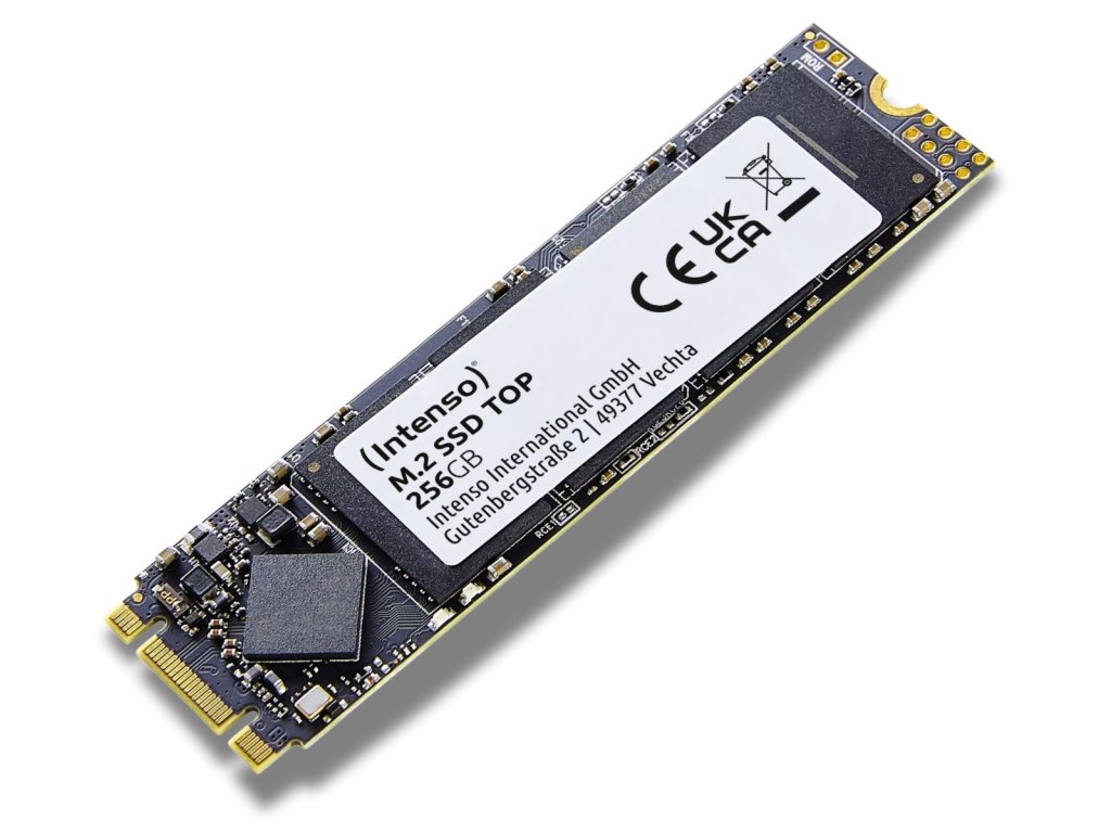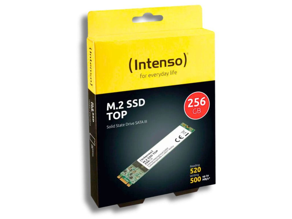 Interní SSD disk INTENSO TOP 256 GB v provedení M.2 2280 SATA. Rychlost čtení 520 MB/s, zápisu 500 MB/s, tichý provoz.