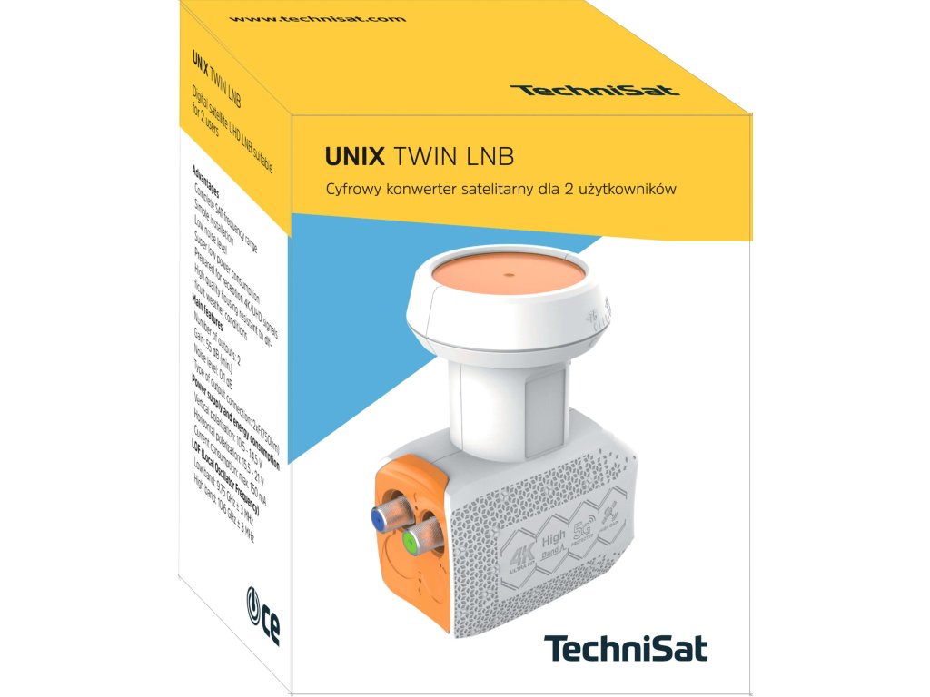 Vysoce kvalitní LNB konvertor od německé firmy Technisat, určený pro příjem HD, 4K vysílání. Nízké šumové číslo 0,1 dB a vysoký zisk. Má dva výstupy, čili je určen pro dva satelitní přijímače, nebo TV, nebo pro jeden dvoutunerový satelitní přijímač. Nejdůležitější funkce - Špičkový výkon příjmu…