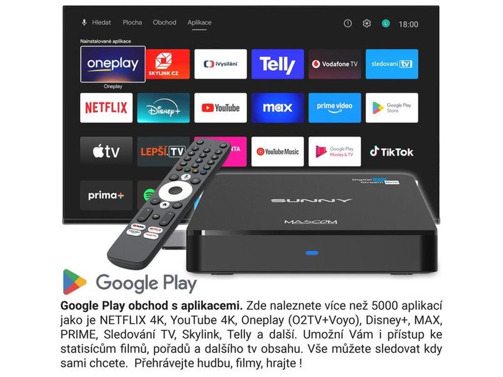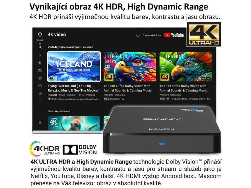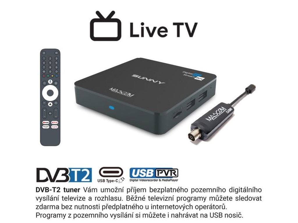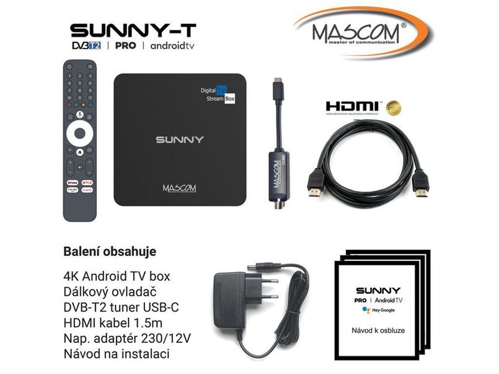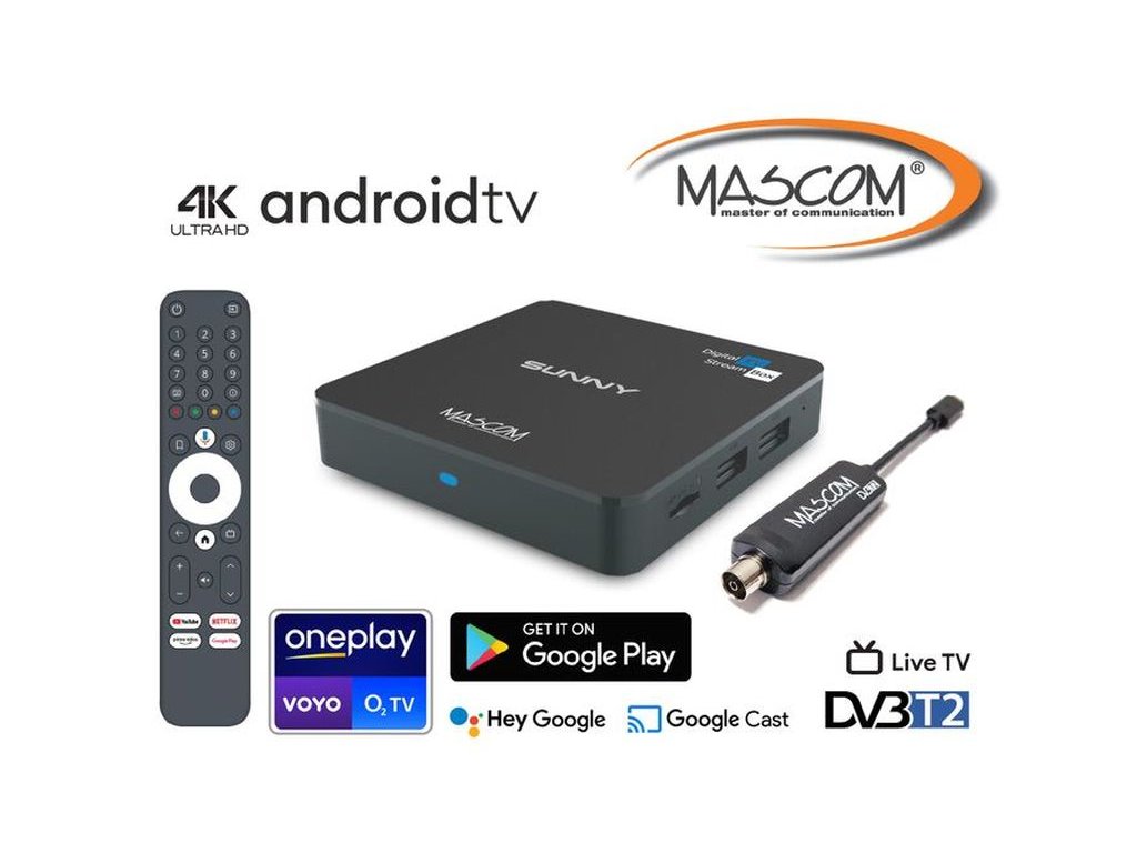 Objevte nový rozměr domácí zábavy s MASCOM SUNNY-T , výkonným Android TV boxem s podporou 4K UHD rozlišení a integrovanou technologií Dolby Vision , který přemění každý televizor na moderní centrum multimediální zábavy. Tento model se od běžných smart boxů odlišuje jedinečnou kombinací funkcí, jelikož kromě streamování z internetu umožňuje i bezplatný příjem pozemního digitálního vysílání DVB-T2 .