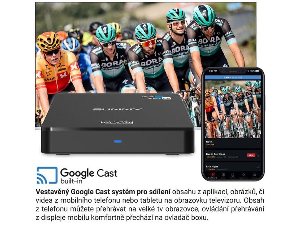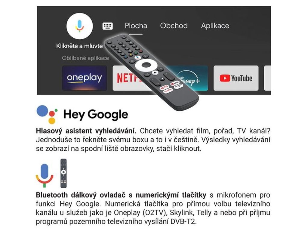 - Funkce: EPG, Timeshift, USB rekordér, Google Cast, Hlasové ovládání, CEC