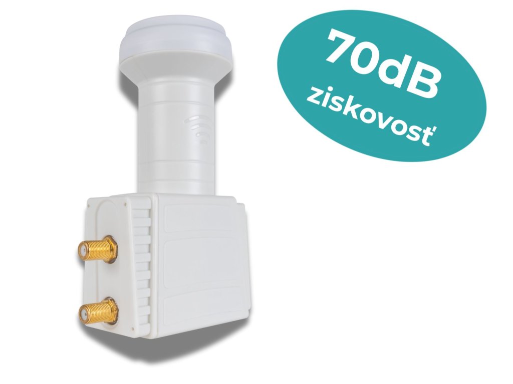 Vysokoziskový Megasat Twin LNB se ziskem 70 dB, šumem 0.1 dB, LTE filtrem a dvěma výstupy pro stabilní příjem i na menších parabolách.