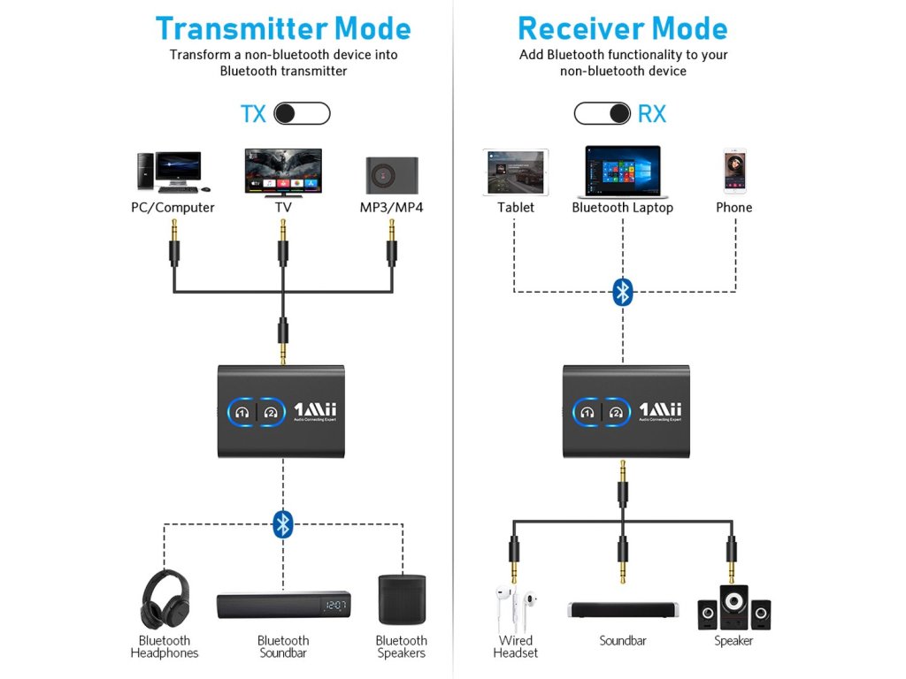 - TX – režim vysílače : Propojte TV, PC, MP3 přehrávač či palubní zábavu v letadle a bezdrátově streamujte zvuk do Bluetooth sluchátek nebo reproduktorů.