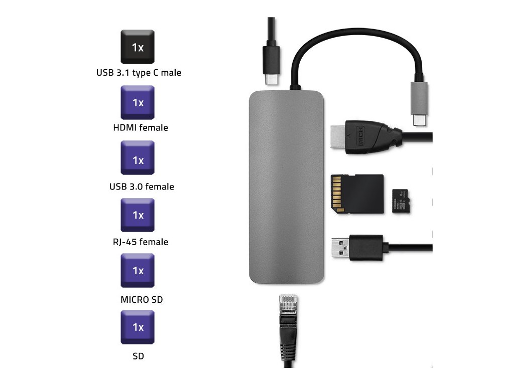 Typ: USB 3.1 Type C samec / HDMI samice + USB 3.0 samice + RJ45 samice + SD + micro SD + USB Type C PD