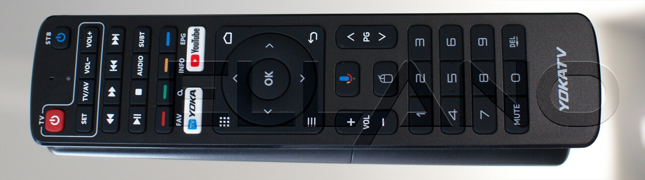 Dálkový ovladač podporuje infračervené i Bluetooth spojení , díky čemuž nemusíte box přímo mířit. Obsahuje mikrofon , pro hlasové ovládání a má také možnost naprogramování 4 základních tlačítek pro ovládání Vašeho televizoru. Nechybí zkratky pro Youtube, YokaTV a přepnutí do režimu myši.