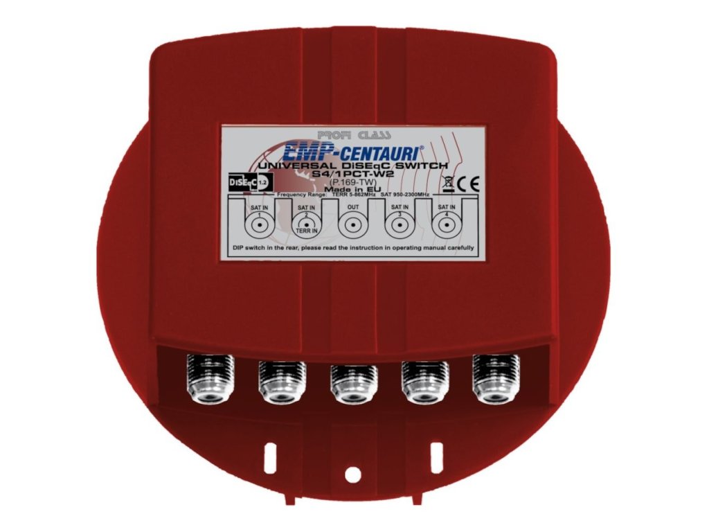 Univerzálny DiSEqC prepínač 4 vstupy 1 výstup EMP Centauri je určený pre jedného používateľa, ktorý chce prepínať viac LNB alebo kombinovať satelitný príjem s pozemným signálom. Vstup SAT IN 2, TERR IN dokáže trvalo prepúšťať terestriálne pásmo na výstup, takže máte TV aj rádio bez ďalších rozbočovačov. Podporuje príkazy DiSEqC 1.0, 1.1 aj 1.2 a vďaka konfiguračným páčkam vie fungovať aj ako Uncommitted DiSEqC 1.1 alebo ako prevodník povelov z DiSEqC 1.2 na 1.0. Hodí sa do bežných domácich zostáv aj do zložitejších rozvodov s ďalšími prepínacími prvkami.