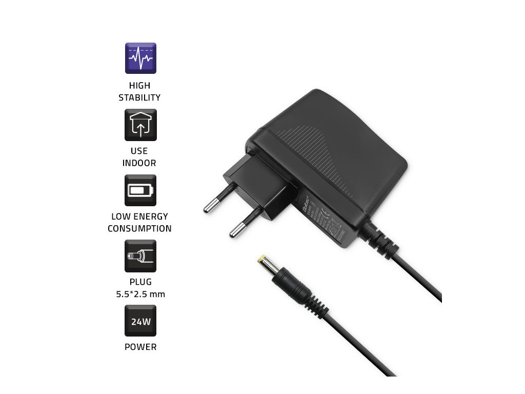 Qoltec náhradný napájací adaptér PREMIUM 24W, 12V, 2A s konektorom 5,5x2,5 mm, ideálny pre širokú škálu zariadení. Poskytuje bezpečné napájanie s ochranou proti prepätiu a preťaženiu.