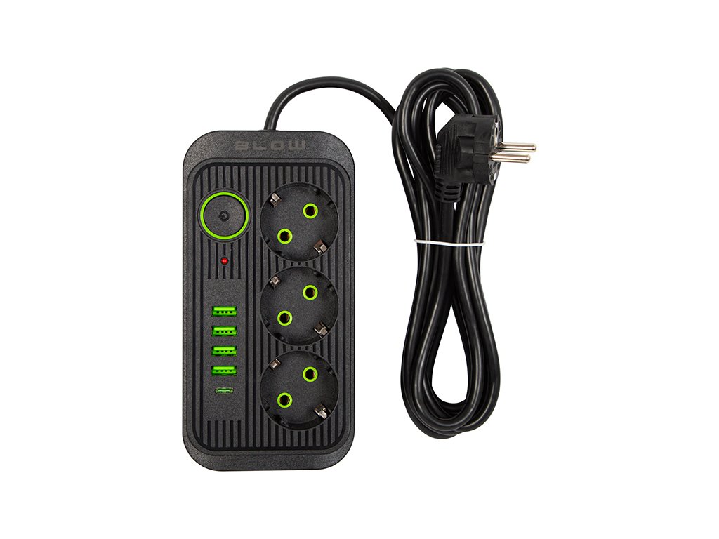 Čierna predlžovačka BLOW PS-330S s 3 zásuvkami, 4 USB portami a USB-C. Dĺžka 3 m, vysoká kvalita spracovania a vypínač pre bezpečné používanie.