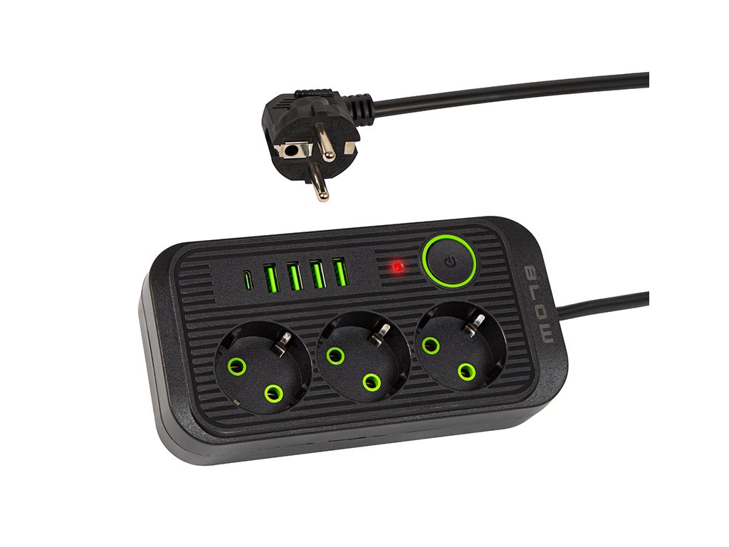Čierny napájací predlžovací kábel BLOW s tromi zásuvkami určený pre domáce použitie. Predlžovací kábel umožňuje pripojiť zariadenia, ktoré sú ďaleko od elektrickej zásuvky. Na jednej strane má výrobok tri pod uhlom otočené zásuvky a vypínač a na druhej jedinú šikmú zástrčku.