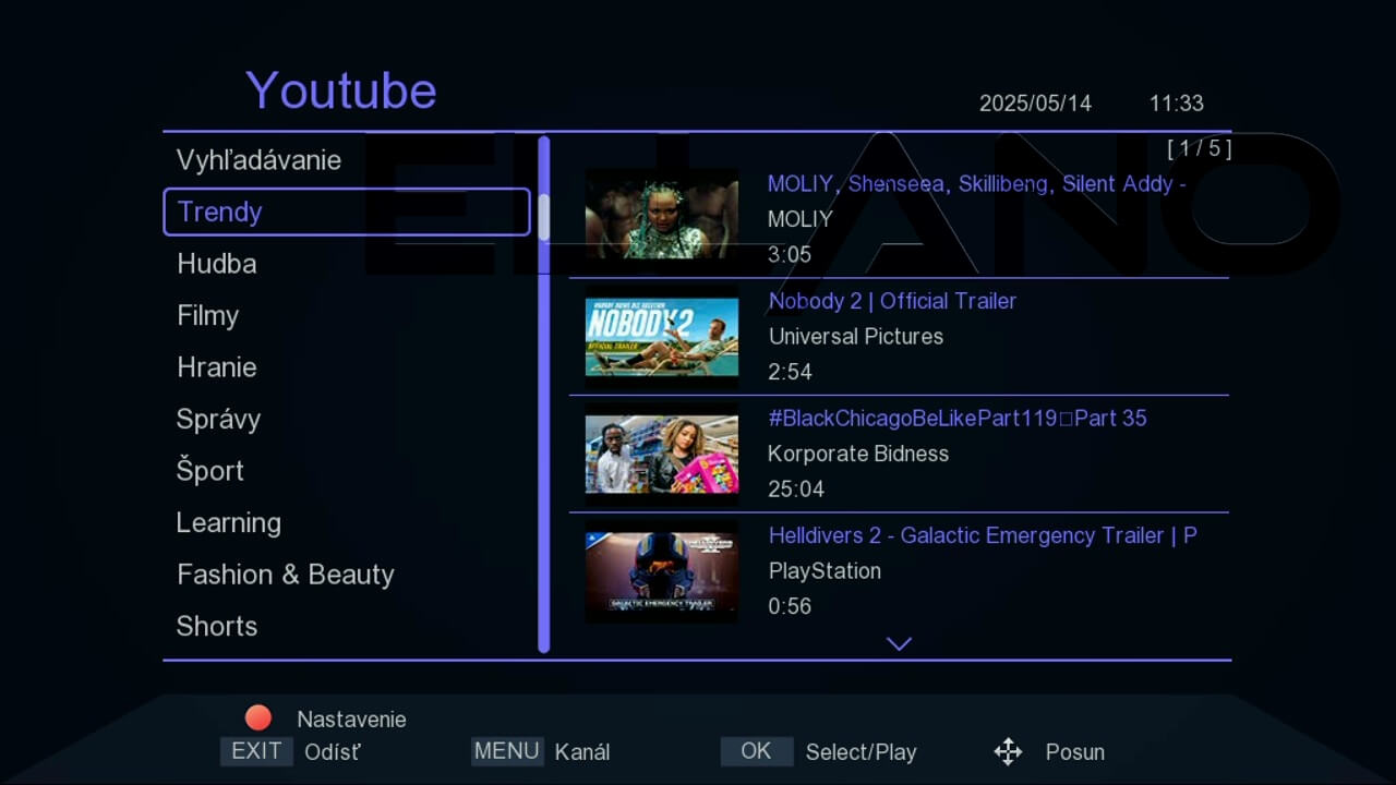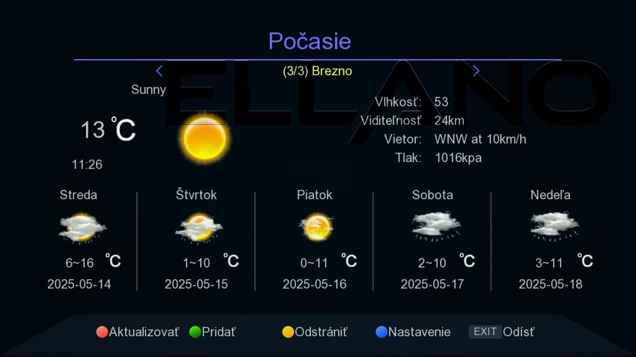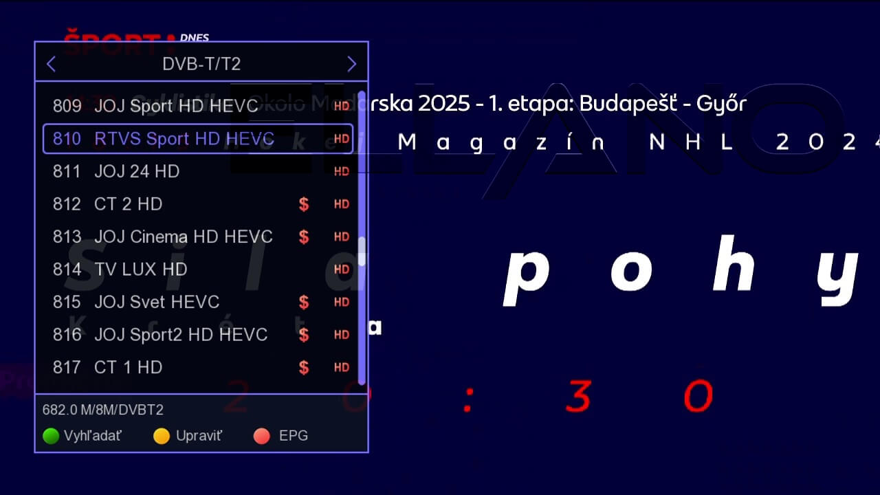 - EPG (elektronický programový sprievodca) – zobrazí podrobné informácie o práve vysielaných programoch