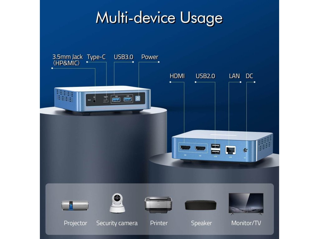 Mini PC je kompatibilný s monitormi, televízormi, projektormi aj kancelárskym vybavením, čo z neho robí univerzálne riešenie pre rôzne scenáre nasadenia.