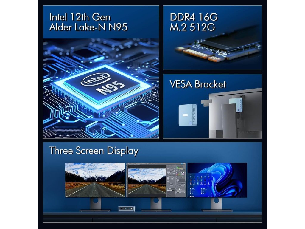 Kompaktný mini PC s procesorom Intel N95 12. generácie, 16 GB DDR4 RAM a rýchlym 512 GB M.2 SSD. Podporuje až tri 4K monitory, má Wi-Fi, Bluetooth, gigabitový LAN a je dodávaný s Windows 11 Pro. Ideálne riešenie pre kancelársku prácu, domácu kanceláriu a každodenné používanie.
