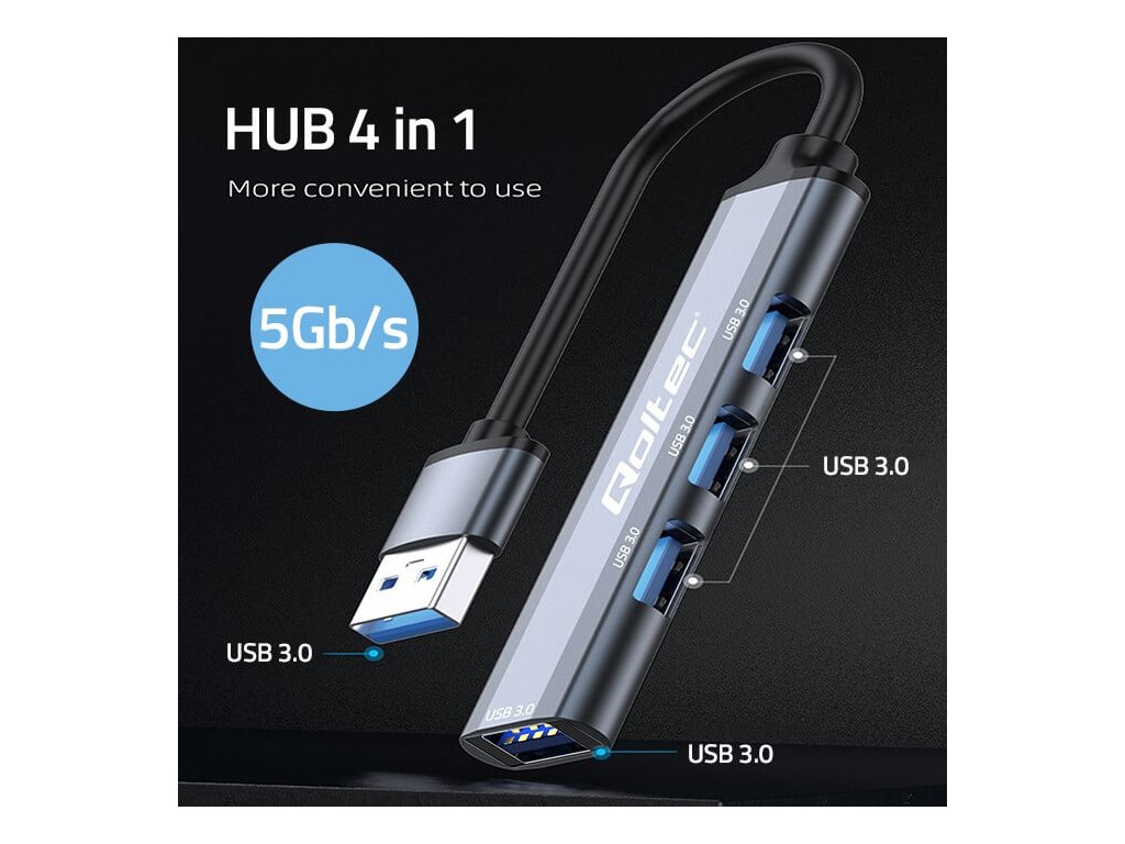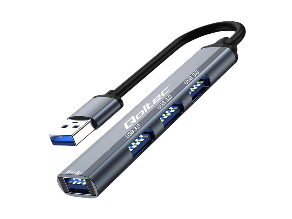 Kompaktný USB hub Qoltec so 4x USB 3.0 portmi, prenos 5 Gb/s, hliníkové telo, Plug and Play, ideálny na cesty.