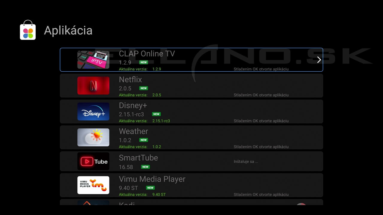 Prijímač disponuje Google Play obchodom pre inštaláciu aplikácií, ale aj vlastným aktualizačným serverom, ktorý pre Vás najpoužívanejšie aplikácie aktualizuje automaticky za Vás. Prinináša aj unikátne aplikácie, ktoré bežne v TV Google Play obchode nie sú, napr. Vimu Media Player pre prehrávanie multimédií po sieti, SmartTube pre prehrávanie Yuutube videí bez reklám, lokalizované online počasie, CastReceiver pre streamovanie, Chrome prehliadač a ďalšie.
